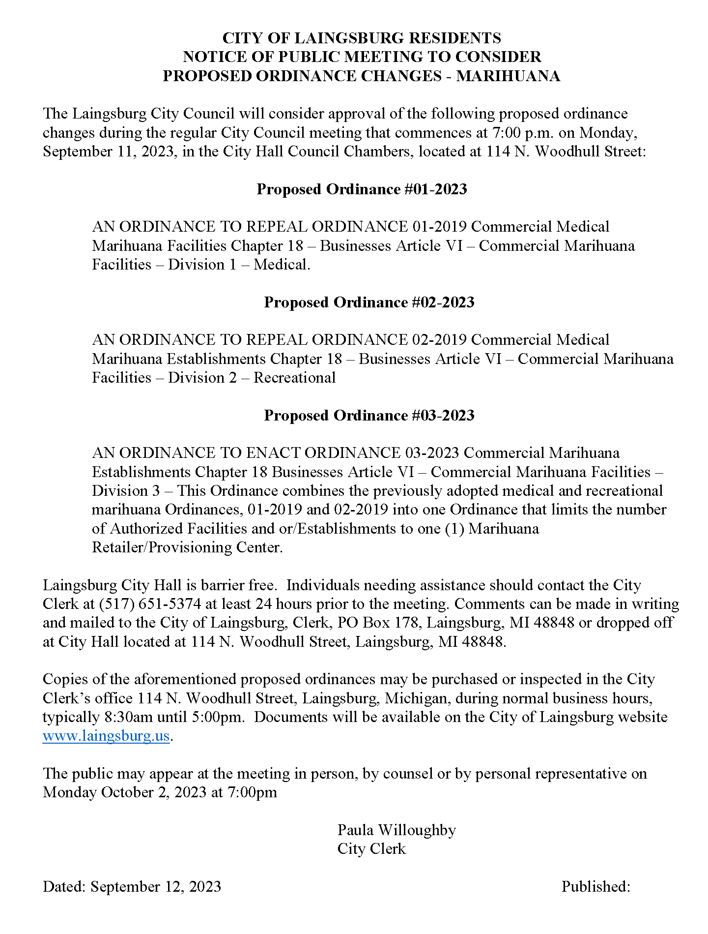 September 29, 2023 Public Notice for Ordinance No. 01-2023, 02-2023 & 03-2023-Authorizing & Permitting Commercial Marihuana Establishments To view Ordinance No. 03-2023 click here