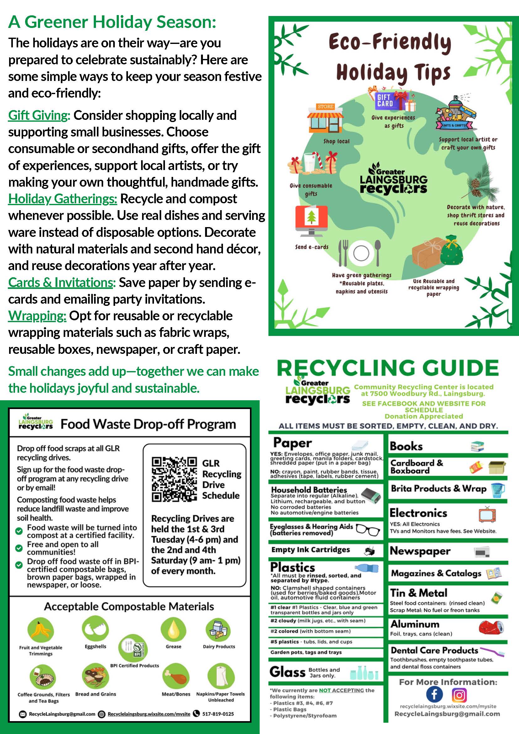 You can visit our website: (https://recyclelaingsburg.wixsite.com/mysite) or Facebook page for more information, or call the numbers given below.