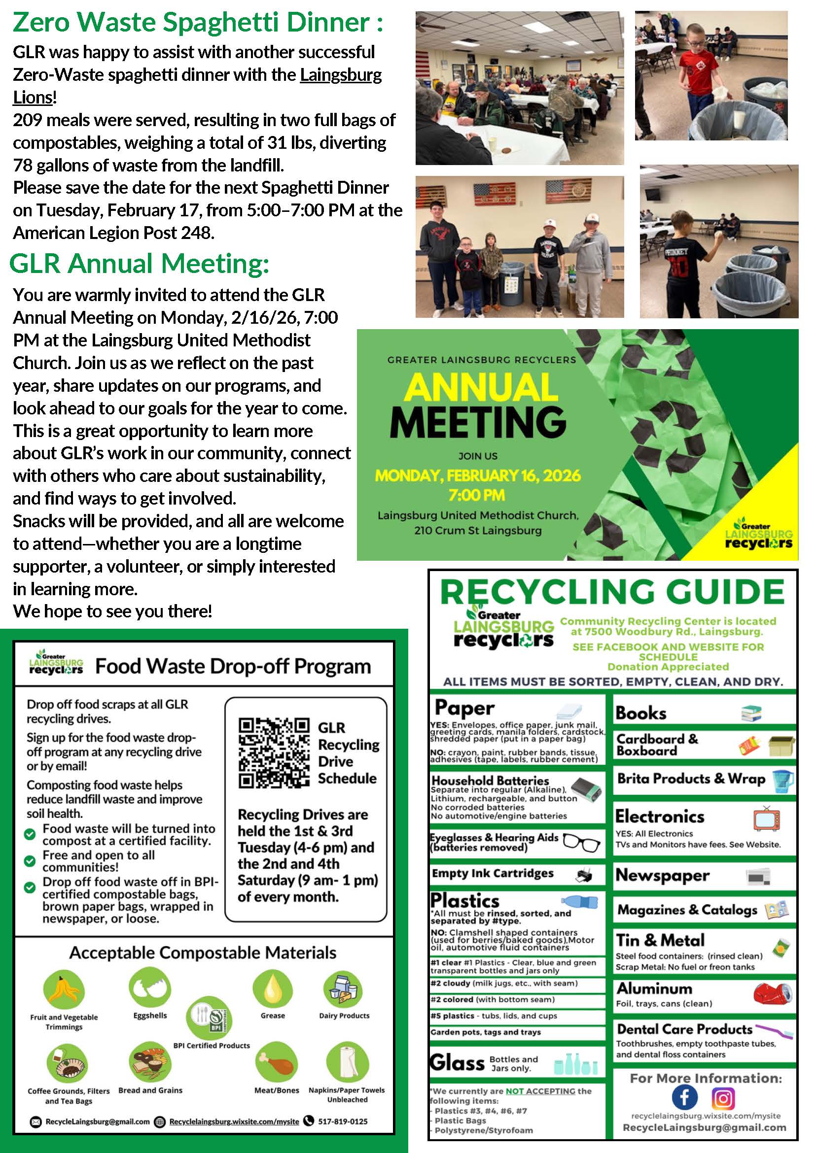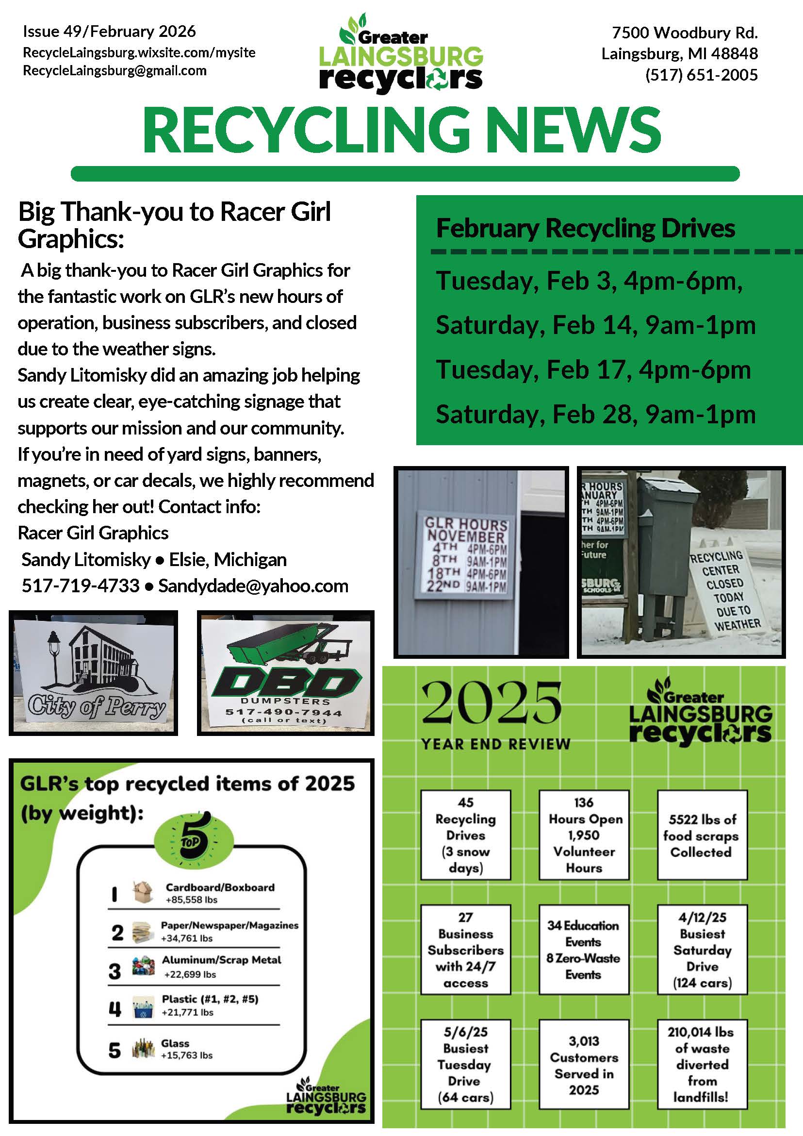 You can visit our website: (https://recyclelaingsburg.wixsite.com/mysite ) or Facebook page for more information, or call the numbers given below.