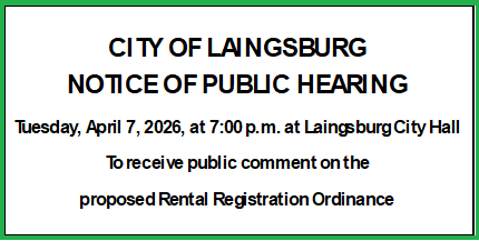 CITY OF LAINGSBURG NOTICE OF PUBLIC HEARING: The Laingsburg City Council will hold a public hearing on Tuesday, April 7, 2026, at 7:00 p.m. at Laingsburg City Hall to receive public comment on the proposed Rental Registration Ordinance. The proposed ordinance would establish a rental registration program, including requirements for […]
