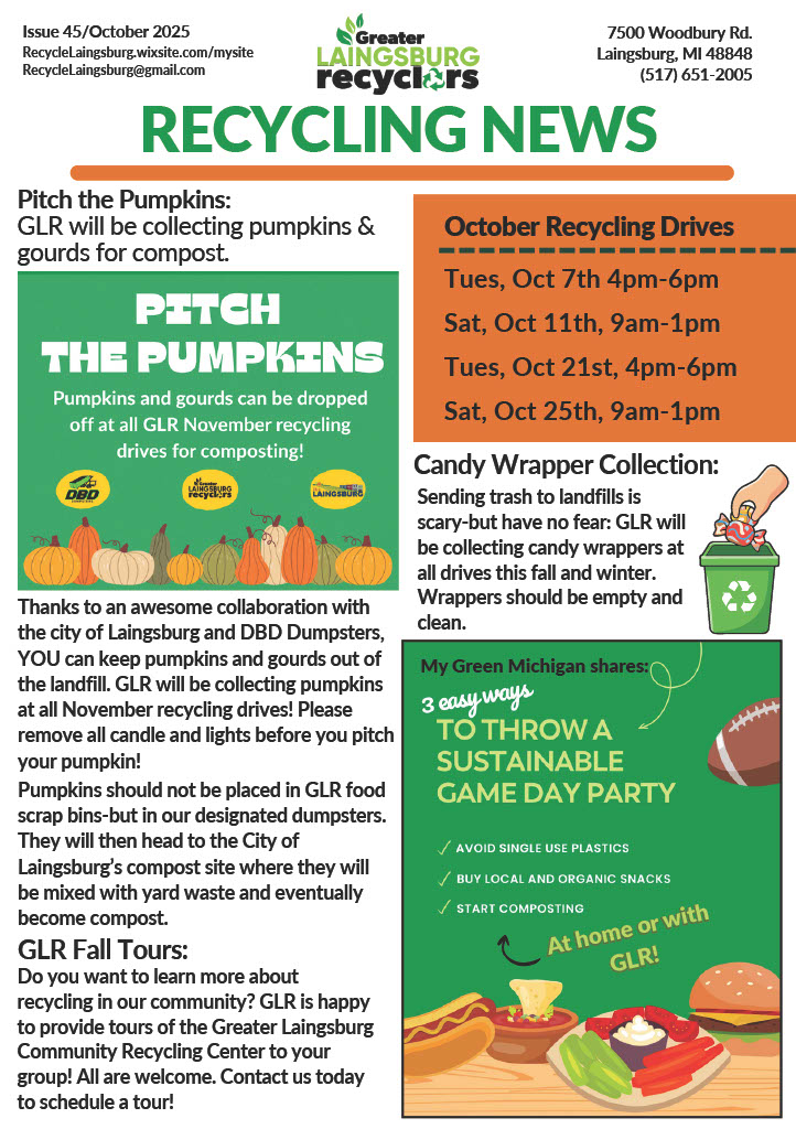 Recycling Newsletter You can visit our website: (https://recyclelaingsburg.wixsite.com/mysite) or Facebook page for more information, or call the numbers given below. For questions re: what we take or more information about anything mentioned, contact Terry or Ellen Link at (517) 651-2005 or Beth Lange at 651-6437.