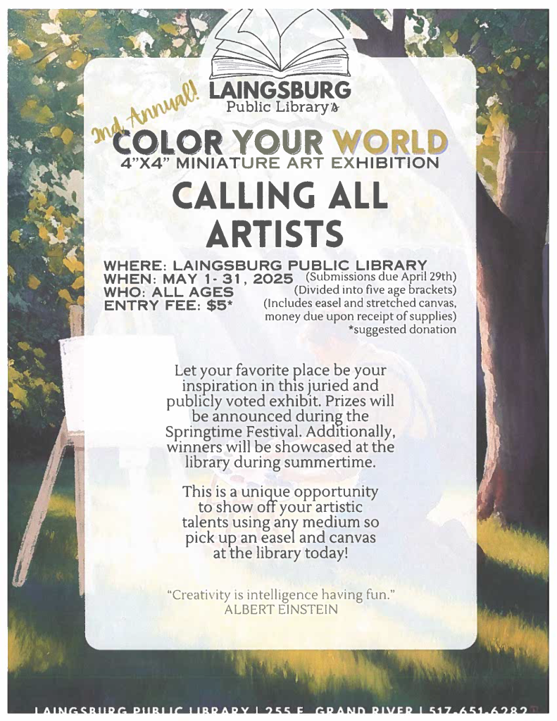 Calling All Artists The Laingsburg Library is have the 2nd Annual Color Your World 4×4 miniature Art Exhibition! Click here for more information!