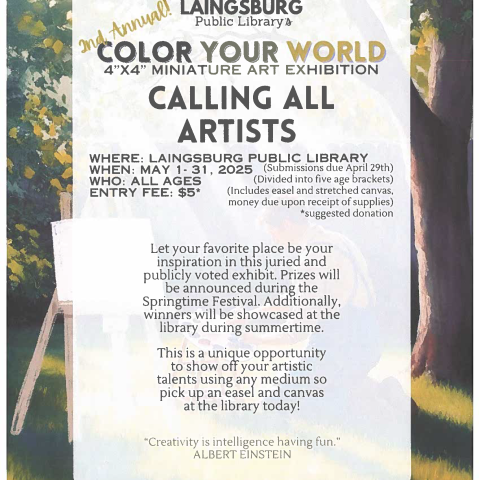 Calling All Artists The Laingsburg Library is have the 2nd Annual Color Your World 4×4 miniature Art Exhibition! Click here for more information!
